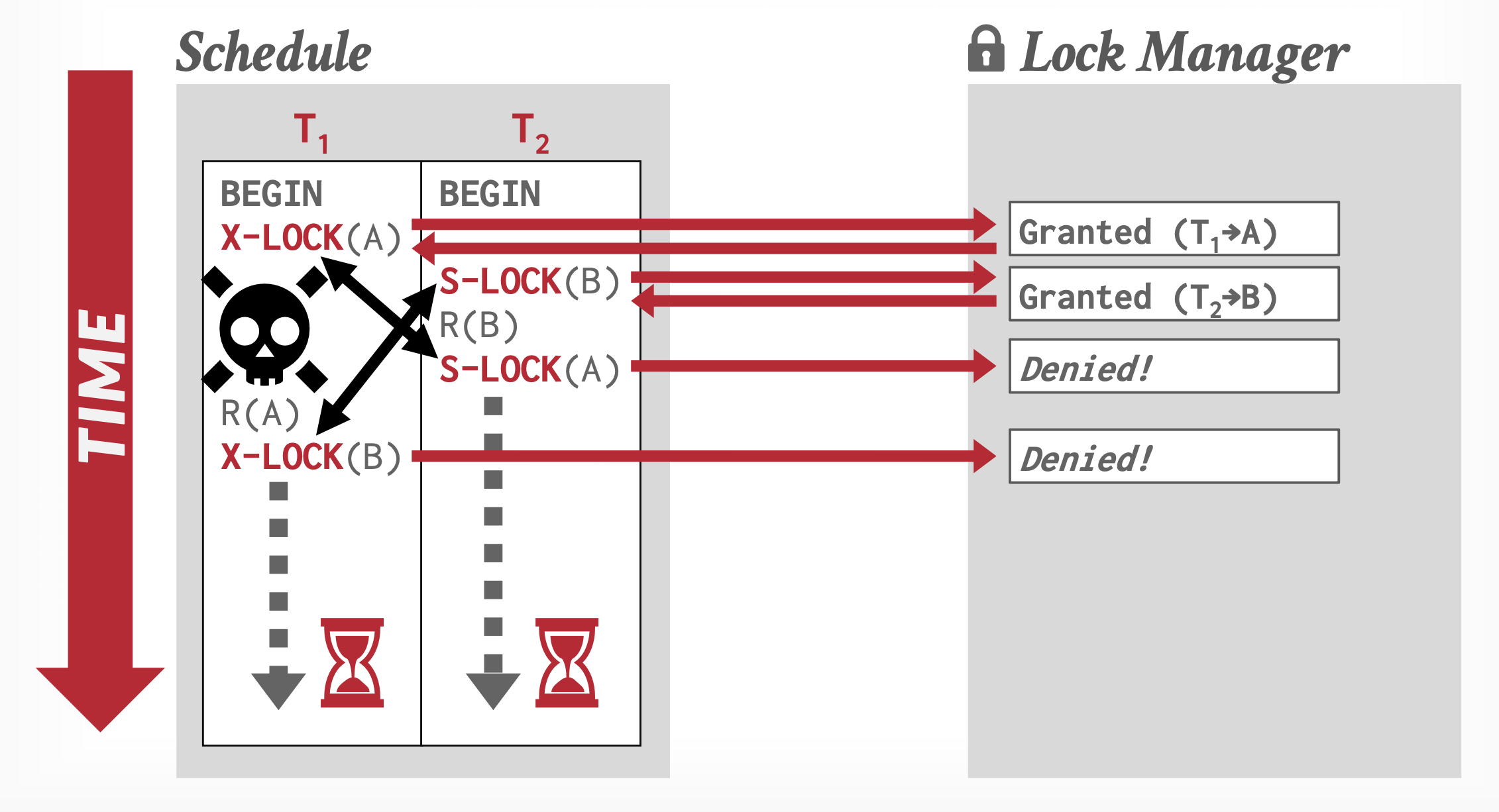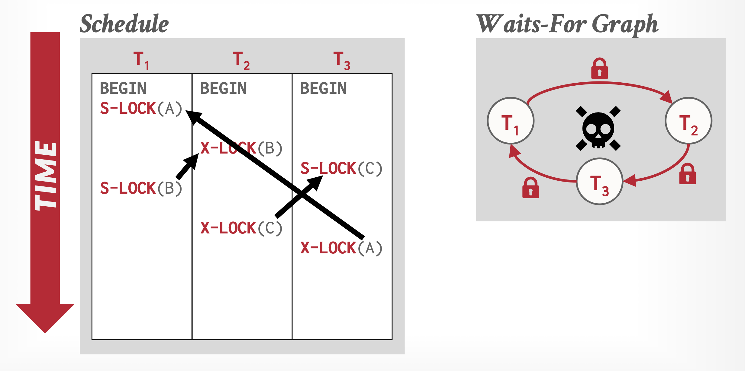 对于一组并发执行的事务,如果没有事务能够继续执行后续操作的话,那么我们就认为发生了死锁(deadlock),此时必须得回滚其中一个事务,使得其他事务得以继续执行。相比没有用锁导致的不一致状态 (inconsistent states) 问题,我们可能相对更能忍受死锁带来的后果,因为该问题可通过回滚事务处理,但不一致状态就没法被数据库系统处理。