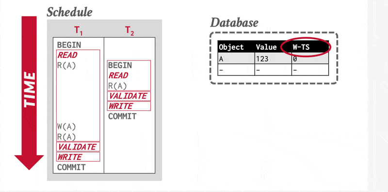 先提交者胜:当事务 \(T_i\) 开始验证时,在其北分配到 CommitTS 后,将执行以下操作作为验证的一部分(为简化说明,我们假设同一时间仅有一个交易进行验证