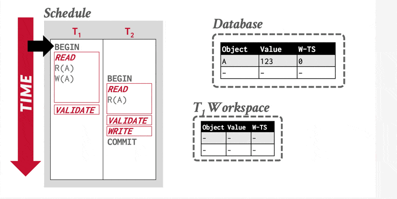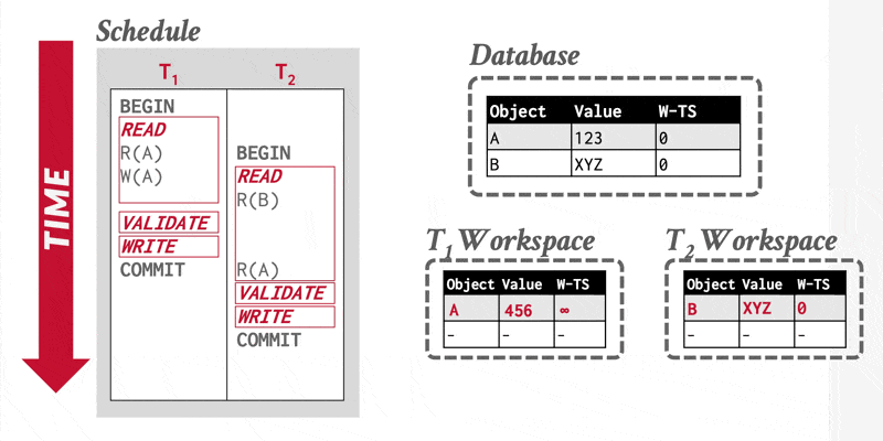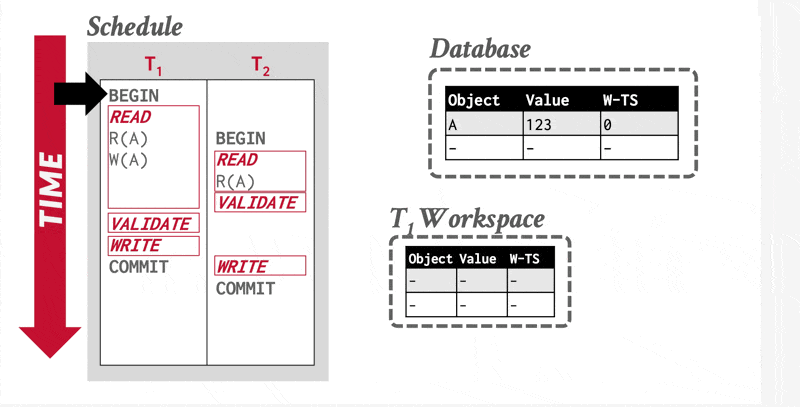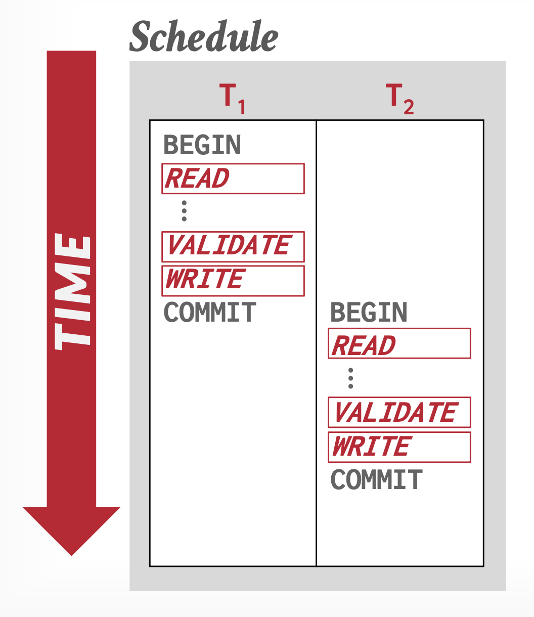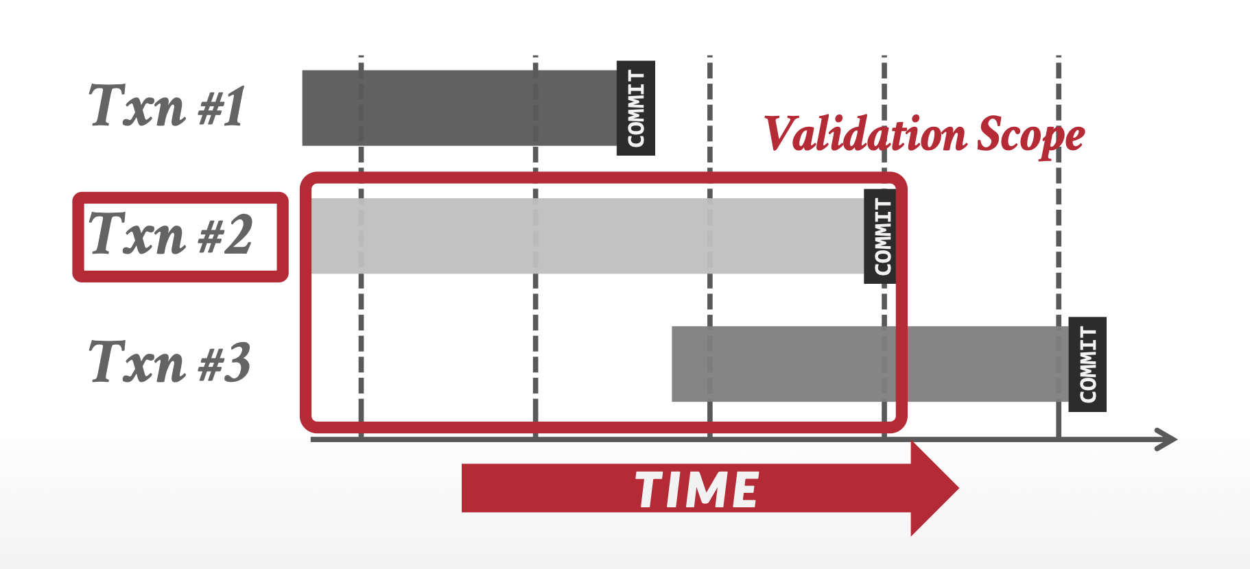 不过在这种方案下,更新数据库的事务可能会与其他同样执行更新的操作产生冲突。所以,在允许事务提交之前,必须对其执行的更新进行有效性验证。所有更新内容会暂存于该事务的私有工作区中,直至通过验证后才会被正式写入数据库。