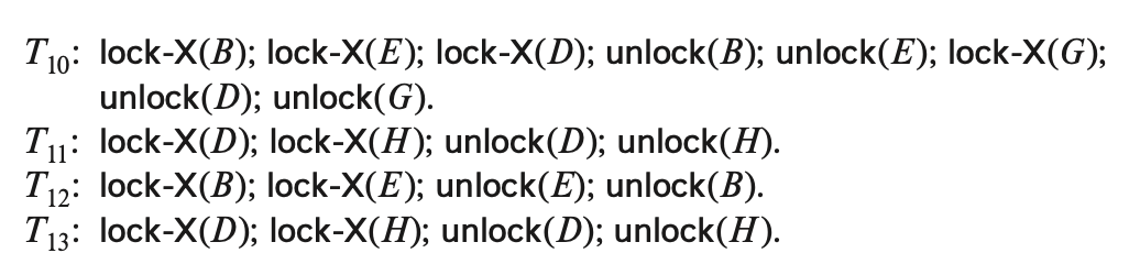 事务的加锁和解锁操作需要遵循一套规则,称为锁协议(locking protocol)。稍后会介绍一些仅允许冲突可串行调度的锁协议,不过在此之前先要了解一些术语:令 \(\{T_0, T_1, \dots, T_n\}\) 为一组参与调度 \(S\) 的事务,