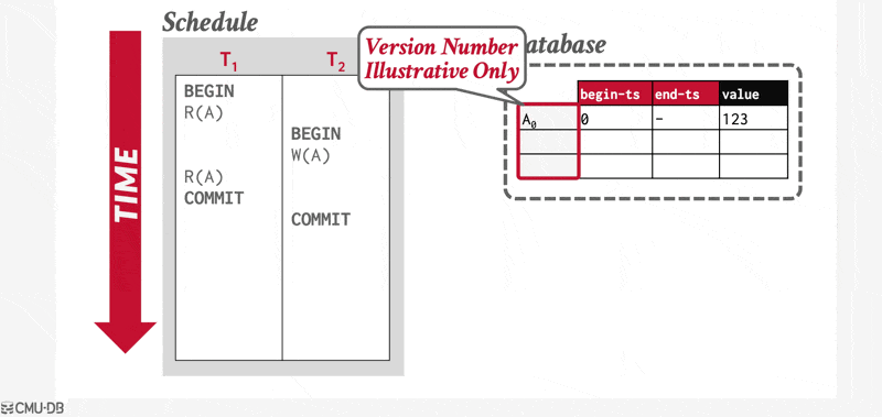 快照隔离基于多版本机制,每个更新数据项的事务都会为该数据项创建一个新版本。各版本仅携带 1 个时间戳——写入时间戳。由事务 \(T_i\) 生成的版本,其时间戳设定为 CommitTS(\(T_i\))。
