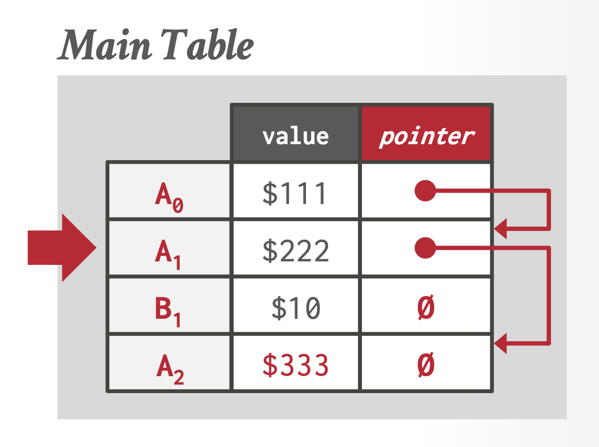 逻辑指针:DBMS 为每个元组使用一个固定不变的标识符;这需要一个额外的间接层,将逻辑 ID 映射到元组的物理位置上,这样对元组的更新只需修改间接层中的映射关系即可。