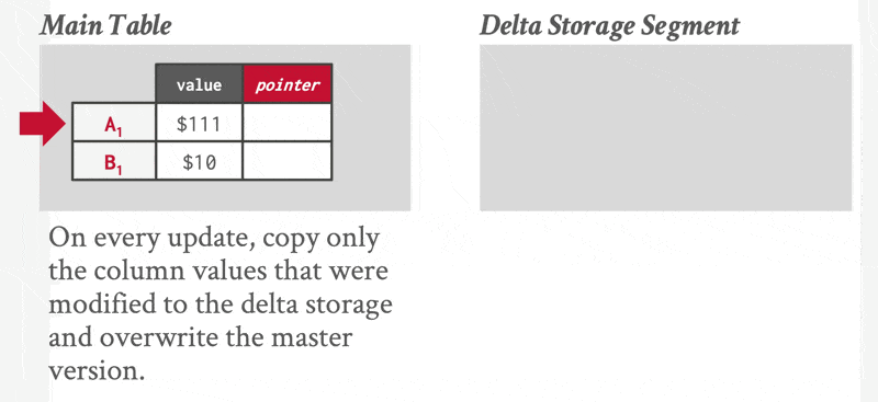- 类似时间旅行存储,但 DBMS 并不保存所有的历史元组,而是仅存储增量或变更部分于所谓的增量存储段(delta storage segment) 中