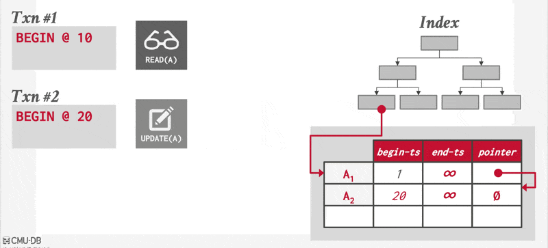 MVCC DBMS 的索引(通常)不会将元组的版本信息与其键一同存储。相反,每个索引都必须支持来自不同快照的重复键(duplicate key),因为相同的键可能在不同快照中指向不同的逻辑元组。