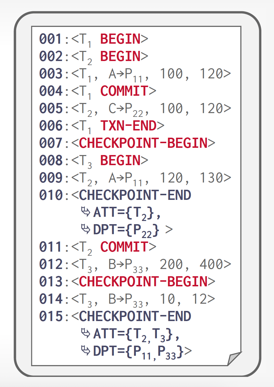 我们用 \(<T_i, X_j, V_1, V_2>\) 来表示一条更新日志记录,这 4 个字母分别对应上述 4 个字段。还有以下记录事务处理中的“重大”事件的特殊日志记录: