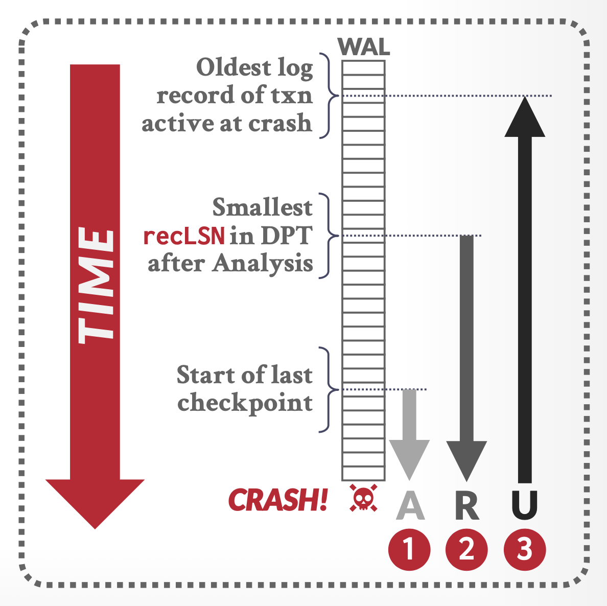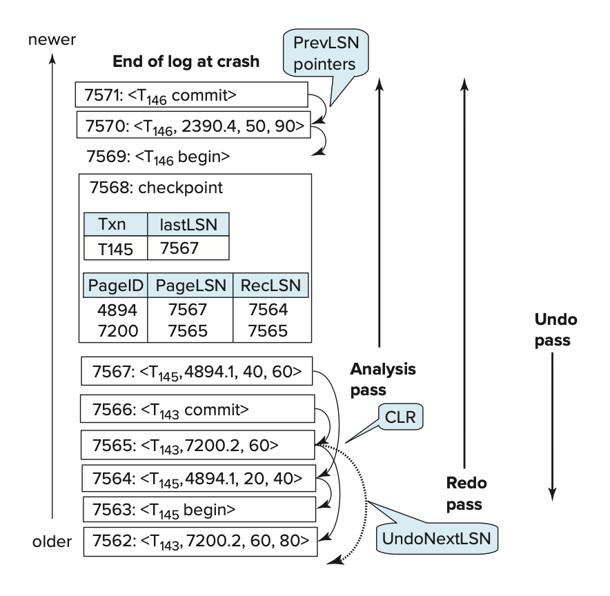 - 分析阶段(analysis pass):确定需要撤销哪些事务、崩溃时哪些页是脏的,以及重做阶段应从哪个 LSN 开始。