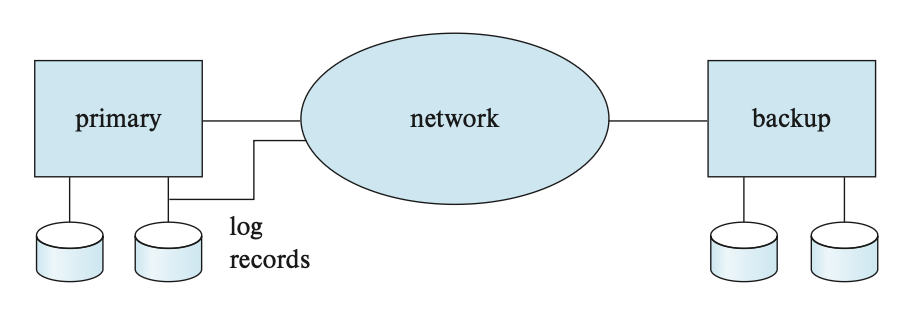 我们可以通过在一个称为主站点(primary site) 的地点执行事务处理,并在远程备份(remote backup) 站点复制主站点的所有数据来实现高可用性。远程备份站点有时也被称为辅助站点(secondary site)。远程站点必须与主站点保持同步,因为主站点会进行更新。通过将主站点的所有日志记录发送到远程备份站点来实现同步。远程备份站点必须与主站点在物理上分开,这样主站点发生的灾难就不会损害到远程备份站点了。下图展示的就是一个远程备份系统的架构: