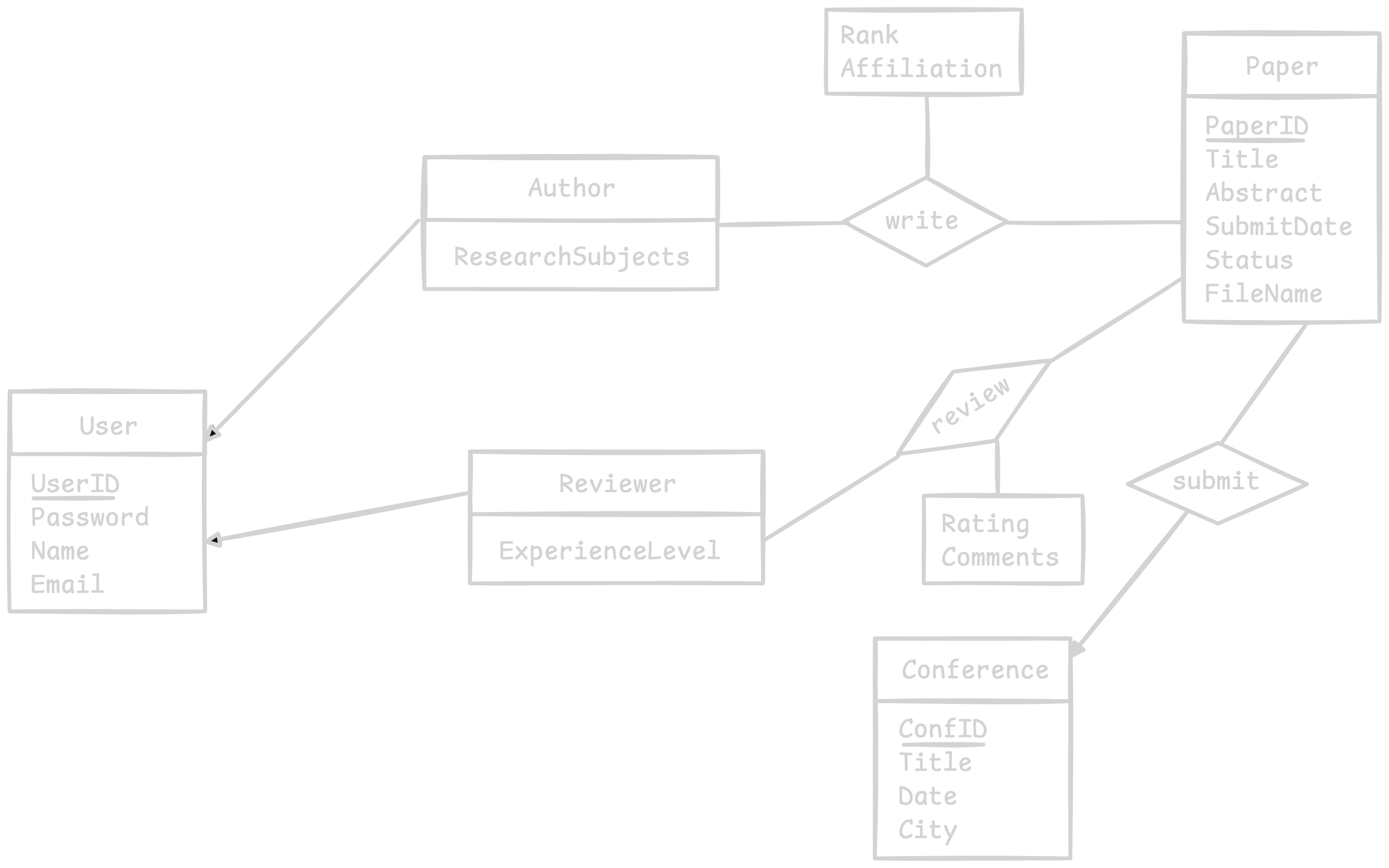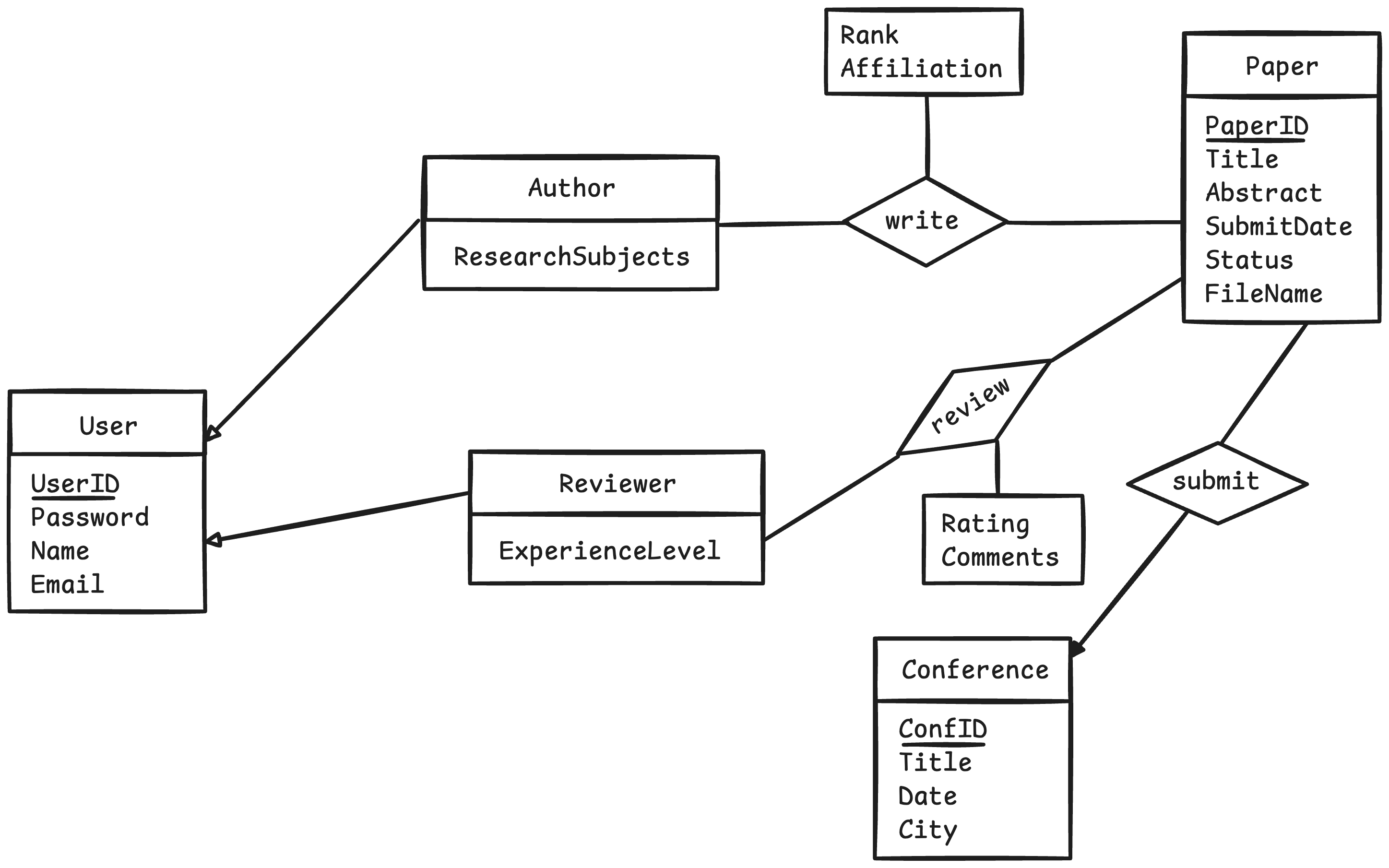 - 评审表(用于实现 Paper 和 Reviewer 之间的多对多关系)