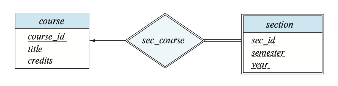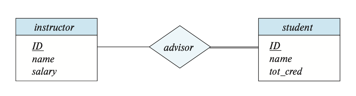 如果实体集 \(E\) 中的所有实体至少参与到联系集 \(R\) 中的一个联系,那么称 \(E\) 完全(total) 参与到 \(R\) 中。而如果存在某些实体没有参与到 \(R\) 中的任何联系,那么称 \(E\) 部分(partial) 参与到 \(R\) 中。