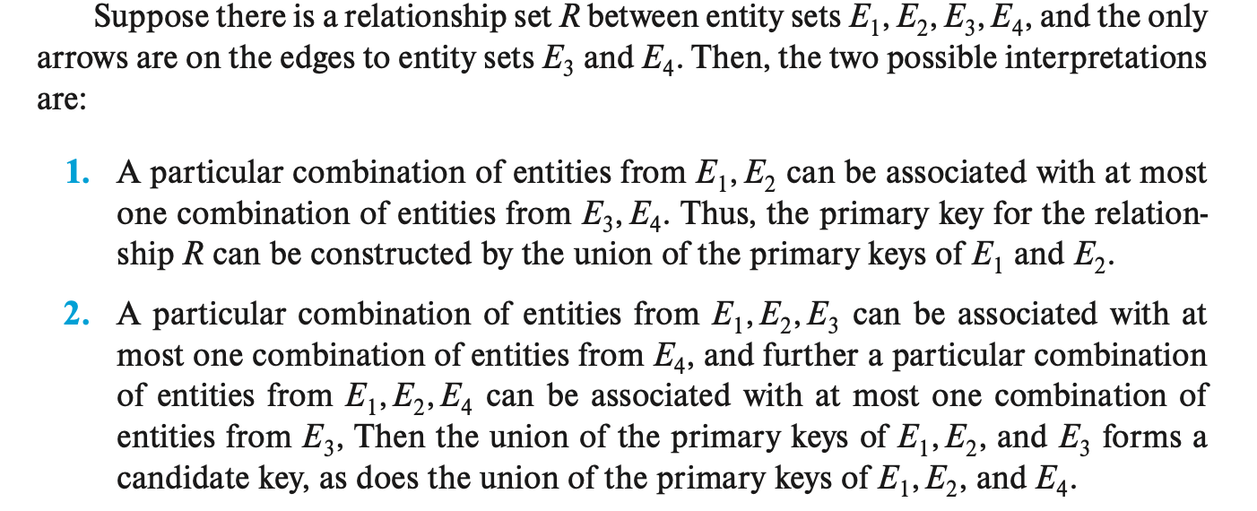 我们可以用“参与(participation)”一词表示实体集之间的关联,即:\(E_1, E_2, \dots, E_n\) 参与到(participate) 联系集 \(R\)。