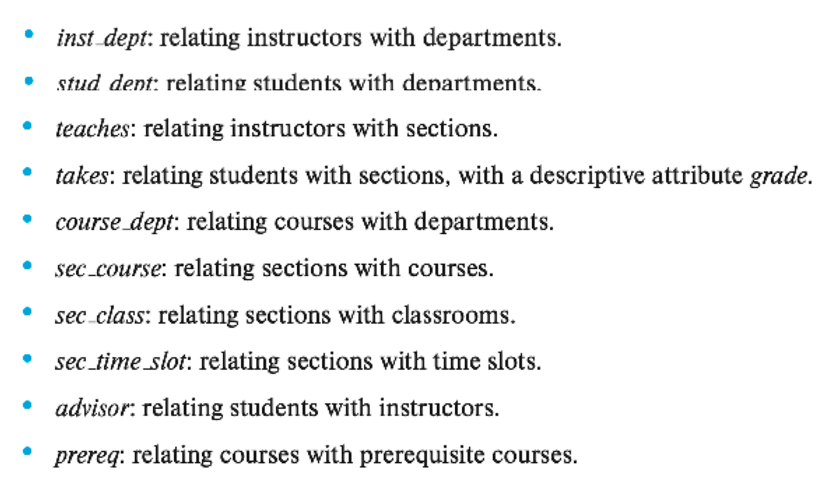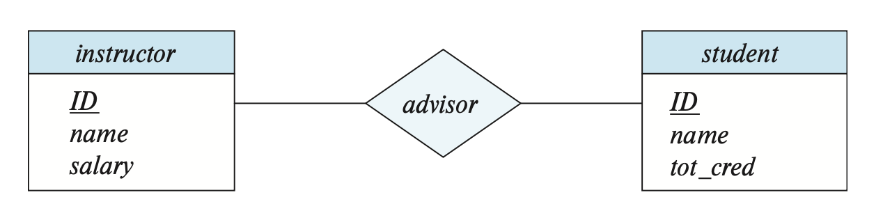 在上图中,我们没有将实体集的属性名标出来,这是因为对于复杂的 E-R 图,用一张图片难以完全表示出来,需要分为多张图片,那么一个实体集可能会出现在多张图中。我们建议仅在实体集第一次出现的时候标出属性名,之后出现时就无需标出属性名,这样可以避免信息的重复,以及随后更新可能导致的不一致性(只改了某些图上实体集的属性,忘改了其他图上实体集的属性