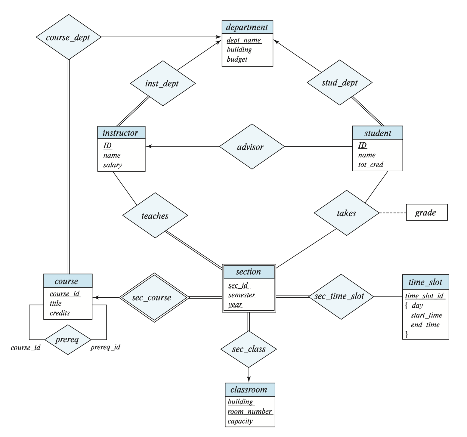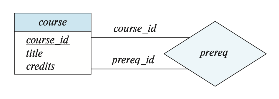 我们定义了一个递归联系集 prereq,它关联了两个相同的实体集 course,而且是靠实体集中相同的属性 course_id 连接起来的。但由于另一个 course_id 用于表示前置课程,所以我们用 prereq_id 这一角色名表示这个 course_id。