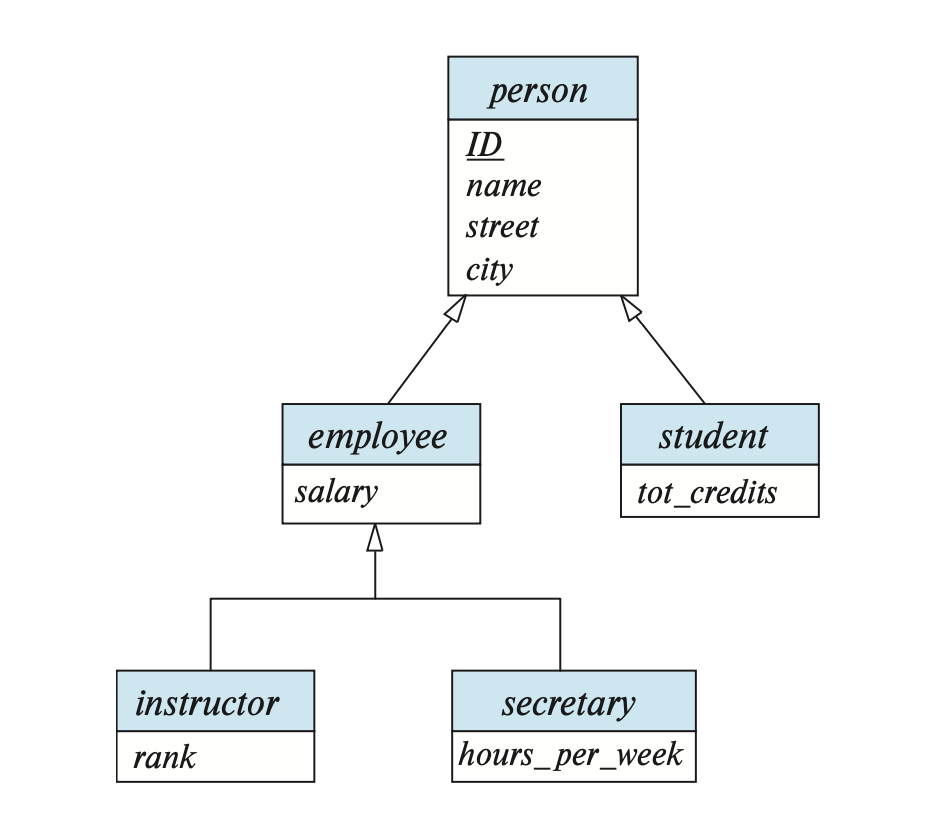 person(ID, name, street, city) employee(ID, salary) student(ID, tot_cred)