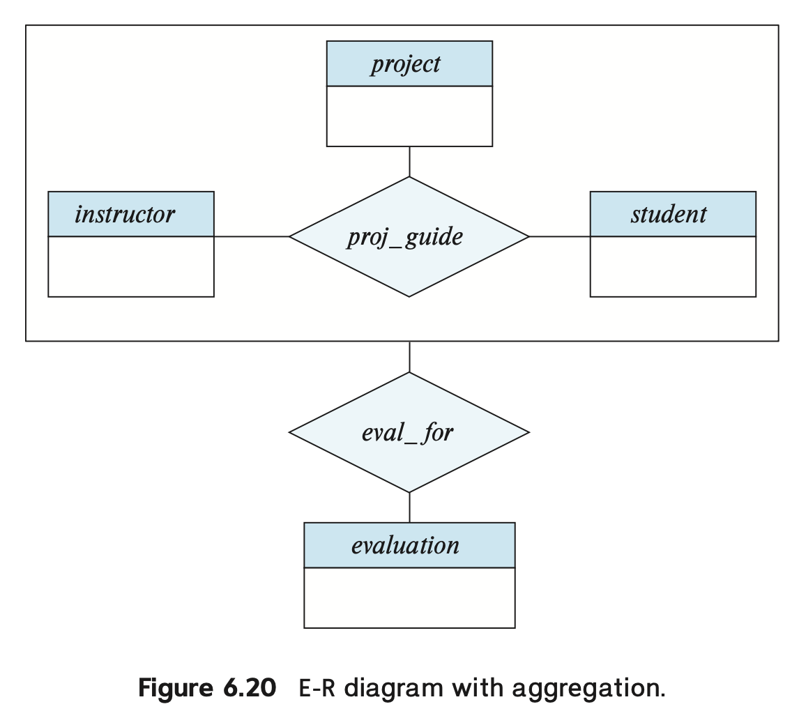 有时,我们可能想要在联系集上建立新的联系,但仅靠我们已知的 E-R 模型知识是无法做到的。也许我们可以通过在参与到这个联系集上的实体集上创建联系来间接实现,但这样做很可能带来信息冗余的问题。为了解决这个问题,这里引入“聚合”(aggregation) 这一概念:将联系视作一个实体,这样就可以在这个“联系”上建立联系了,同时避免了更为复杂的表达。