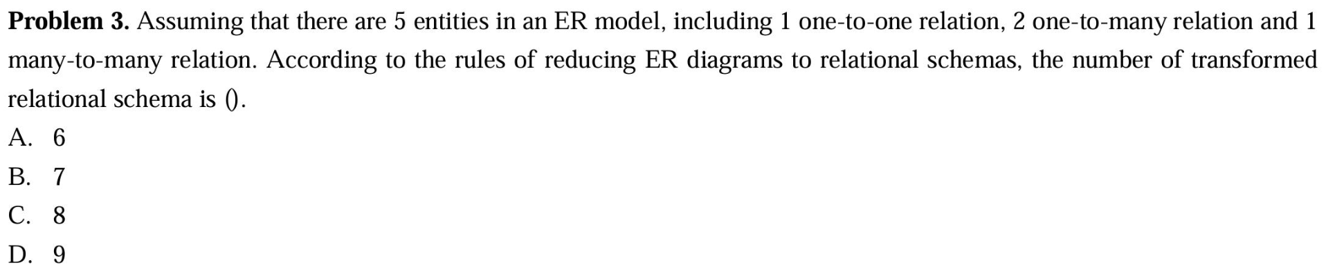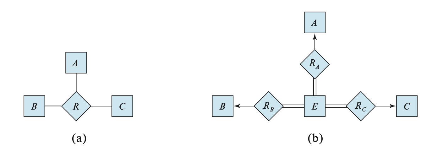 其中要求 \(E\) 完全参与到 \(R_A, R_B, R_C\) 中。如果 \(R\) 里面有属性,那就全都放到 \(E\) 里面。并且还需要为 \(E\) 创建一个特殊的识别属性。对于 \(R\) 中的某个联系 \((a_i, b_i, c_i)\),现在用 \(E\) 里面的某个实体 \(e_i\) 替代。那么就要插入以下联系: