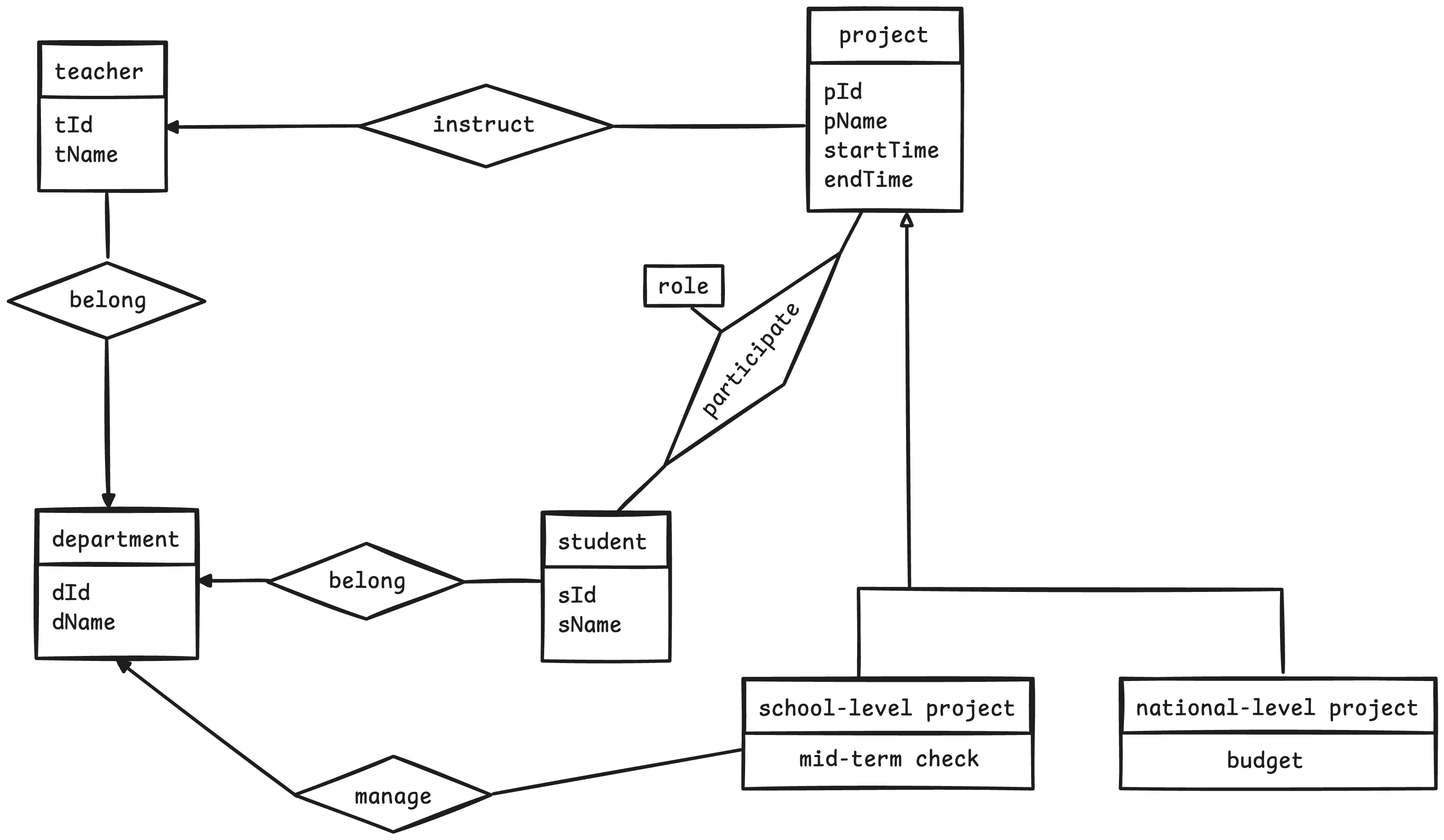 - 多对多:从联系集出发,两根不带箭头的线条指向全部实体集