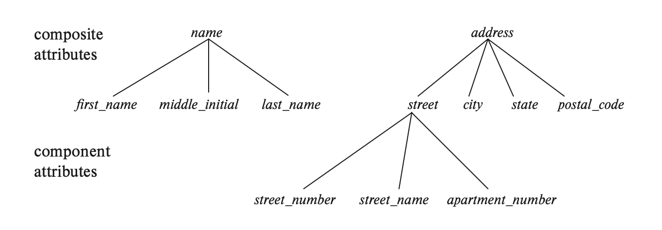 - 举例:name 属性可以被进一步划分为 first_name, middle_initial, last_name 这三个属性,因此是一个复合属性