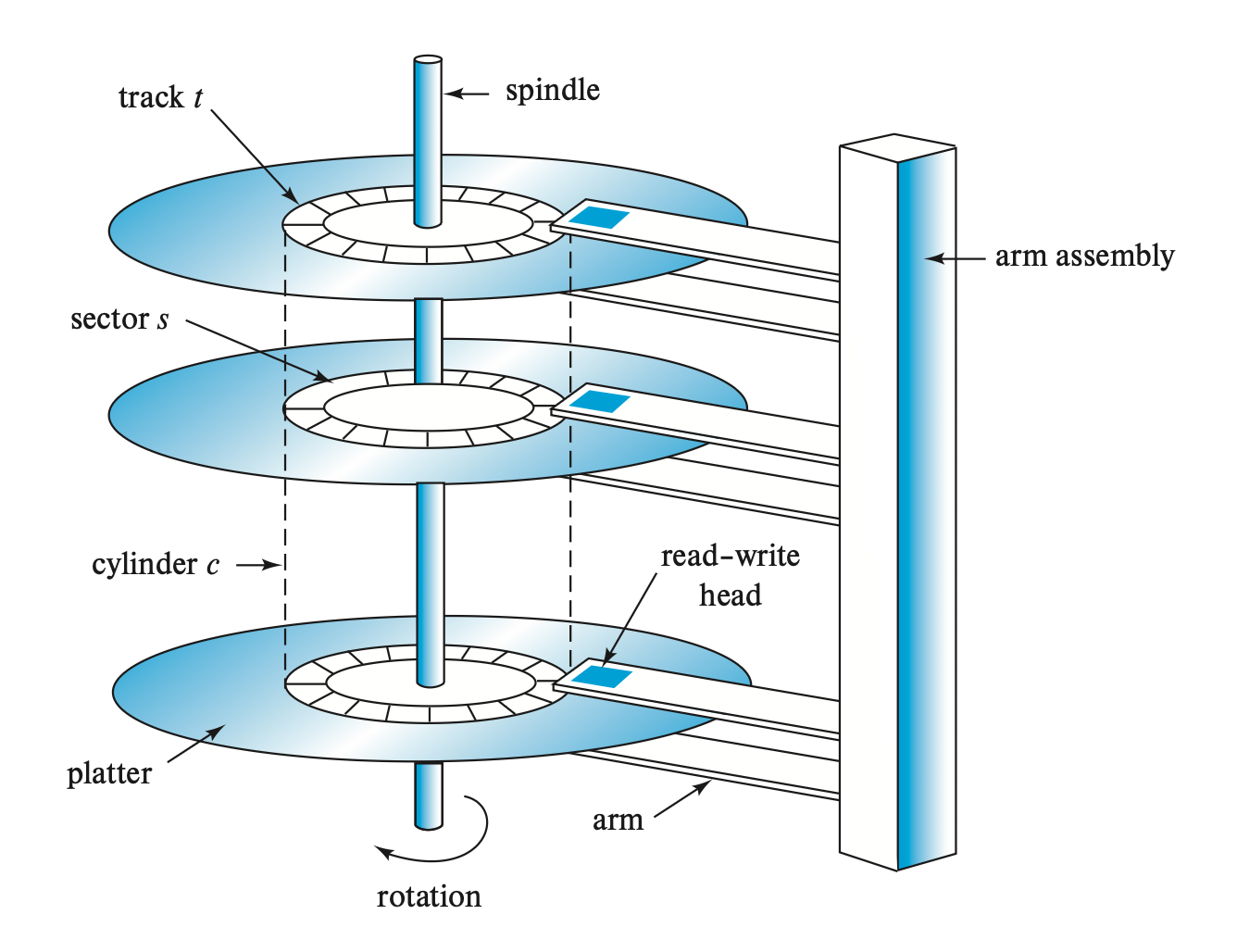- 一组盘片(platters)。每张盘片用刚性金属或玻璃制成,且两面都有磁性材料,用于记录信息