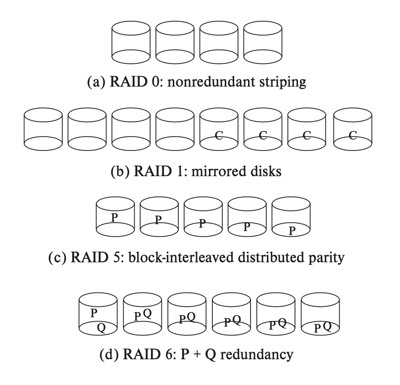 6 级 RAID:P + Q 冗余。类似 RAID 5,但是会多用一个硬盘存储额外的冗余信息,计算的不是奇偶校验位,而是纠错码(error-correcting codes),可以容忍两个硬盘的故障。