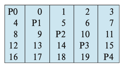 - 上图中,P 表示奇偶校验块。假如有 5 个硬盘,奇偶校验块 Pk 来自于逻辑块 4k, 4k+1, 4k+2, 4k+3 上。下图展示了前 20 个块的分布:
