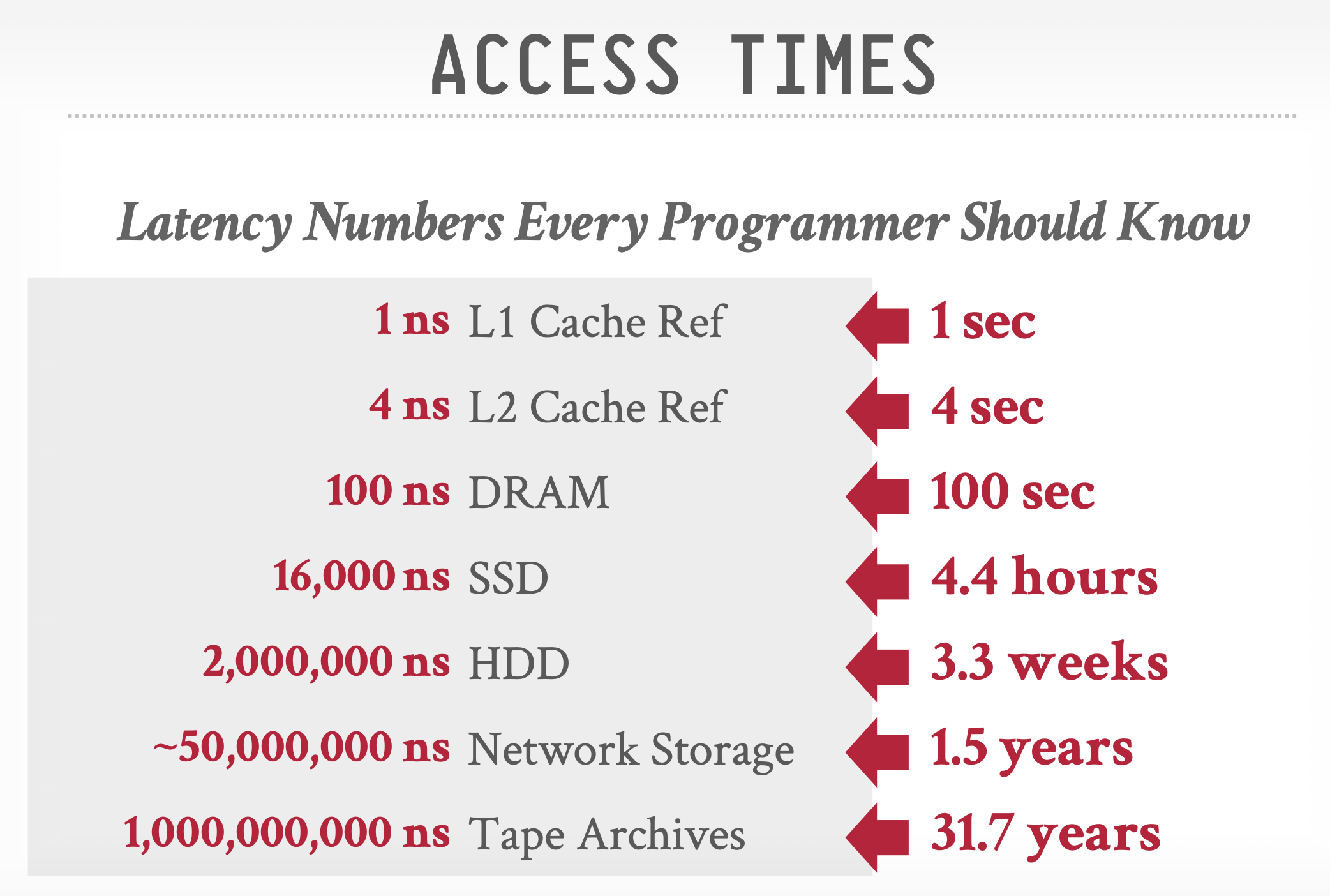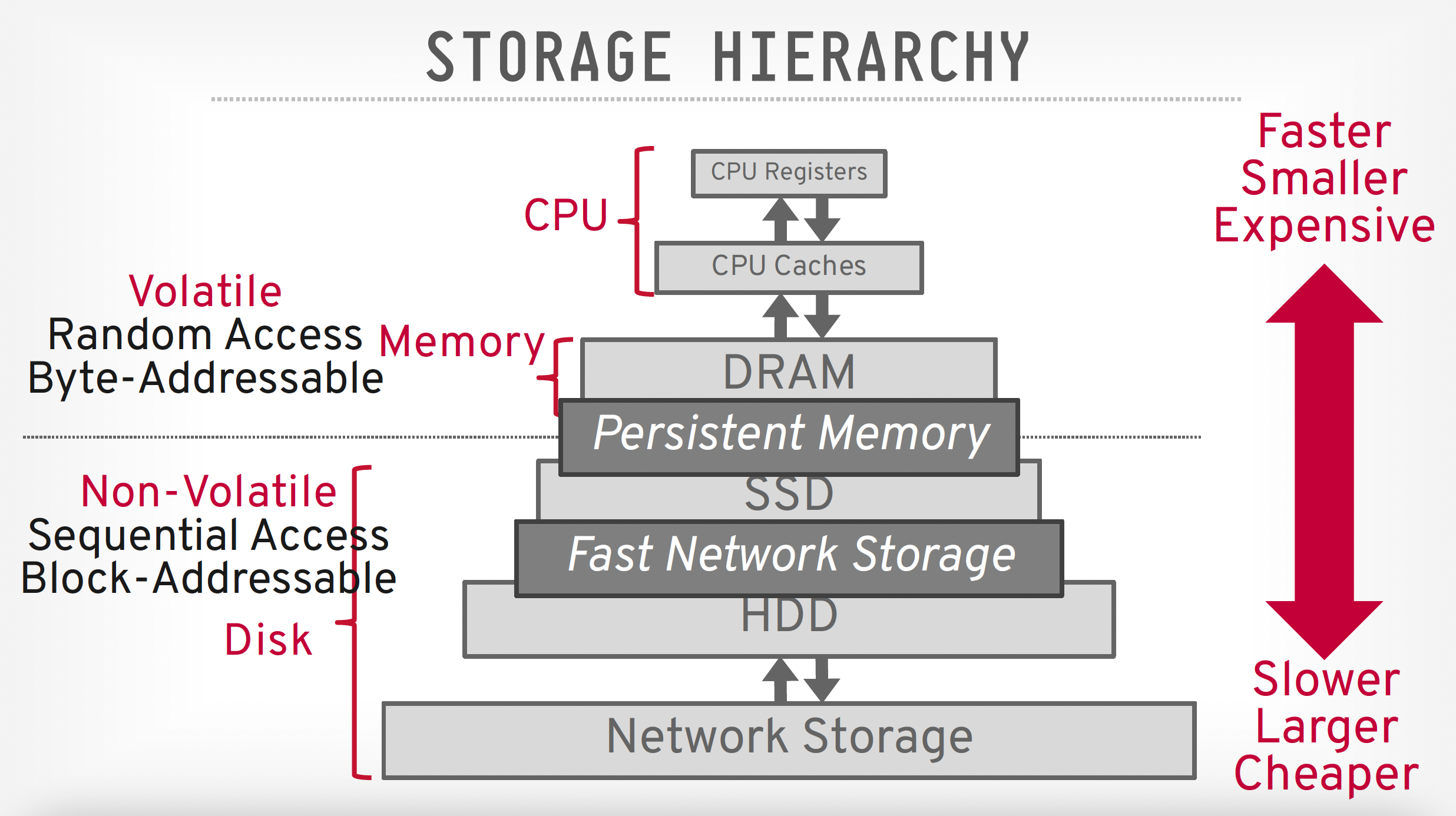 可以看到,有一类称为持久内存的特殊存储设备,它既具备 DRAM 的速度,也有硬盘的持久性。但在课程中,我们不会考虑这种存储设备。它的典型代表是 Intel 的 Optane(但在 2022 年停产了)