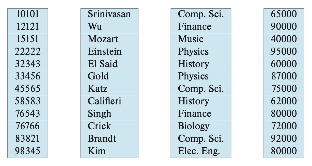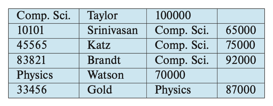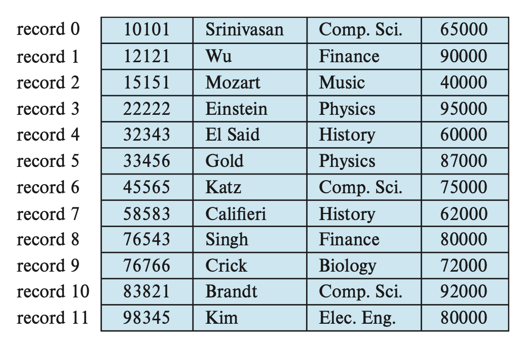 通常数据库系统会将元组中的所有属性放在一条记录里,这样的存储布局称为面向行的存储(row-oriented storage)。相对应的也有面向列的存储(column-oriented storage),它的做法是单独存储关系中的每个属性,一组连续元组的某个属性值被放在文件中的连续位置上,如下所示: