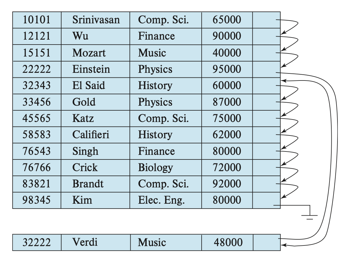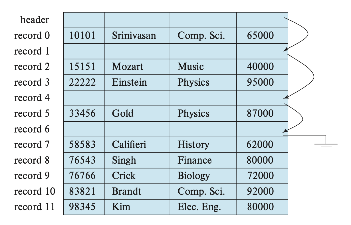 - 在文件开头,我们会分配一些特定的字节作为文件头(file header),里面包含关于文件的信息,这里我们只关心第一个被删除记录(空间空出来了)的地址信息。在这个记录上,我们记录第二个被删除的空余记录,以此类推。所以这些被删除的记录构成了一个链表,通常称为空表(free table)。