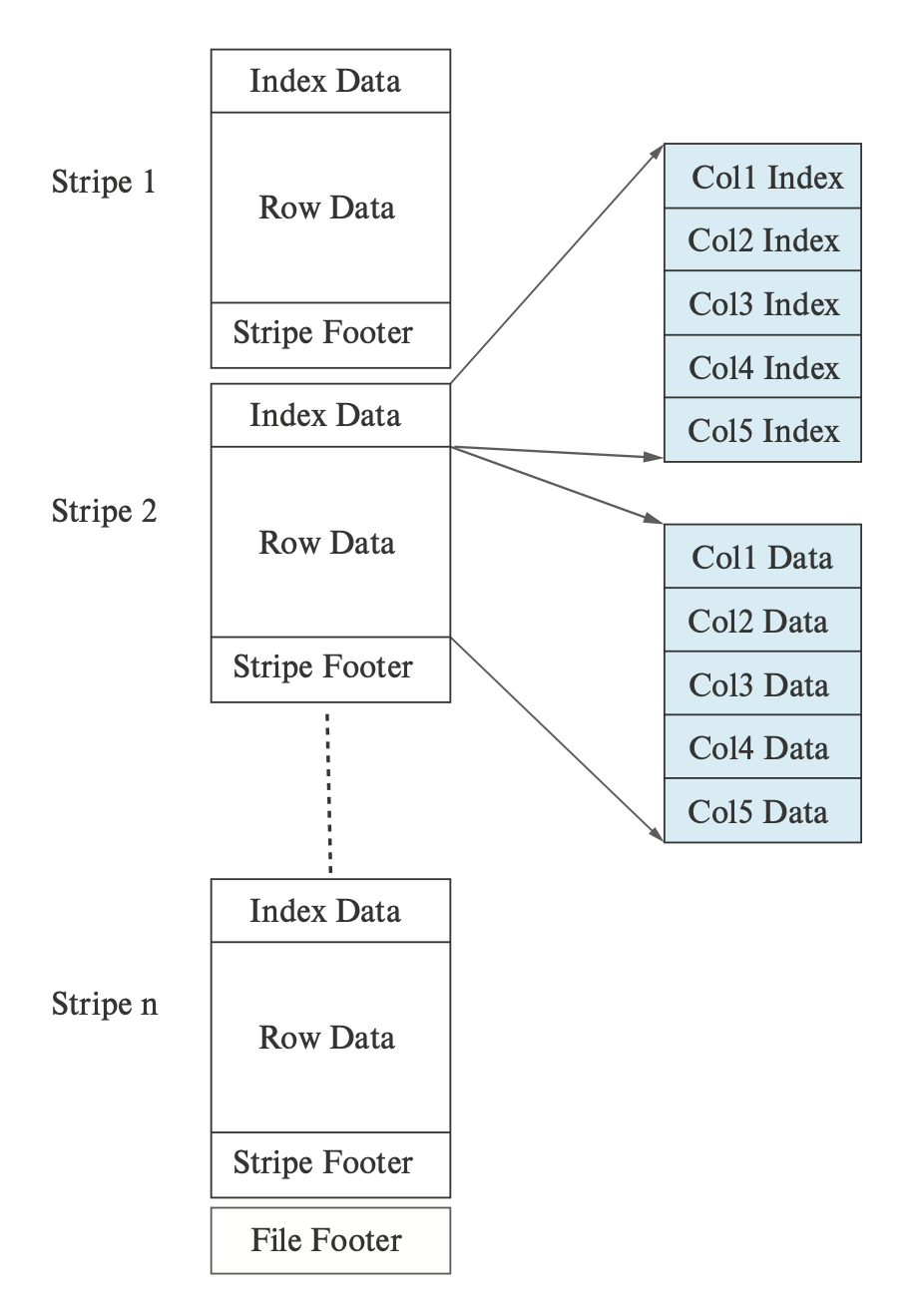 ORC 和 Parquet 是在很多大数据处理应用中用到的列文件表示。其中 ORC 会将占据几百 MB 的元组序列划分为一种称为条(stripe) 的列表示,而一个 ORC 文件会包含多个这样的条,下图展示了 ORC 文件格式的一些细节: