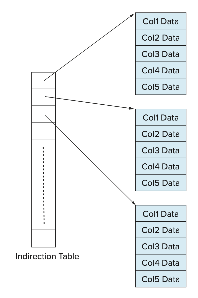 如果主存使用面向列的存储方式,那么某个列的所有值被存储在连续的内存位置上。然而,如果发生了向关系附加记录的情况,为了确保连续的空间分配,需要重新分配已经存在的数据的空间。为了避免这一开销,某个列的逻辑数组会被划分为多个物理数组,并且用一个间接表来存储指向所有物理数组的指针,如下所示: