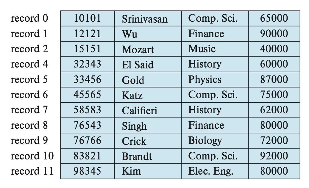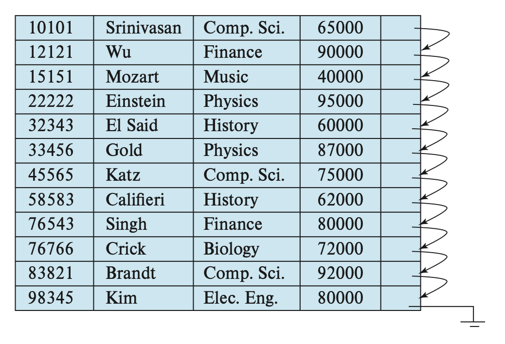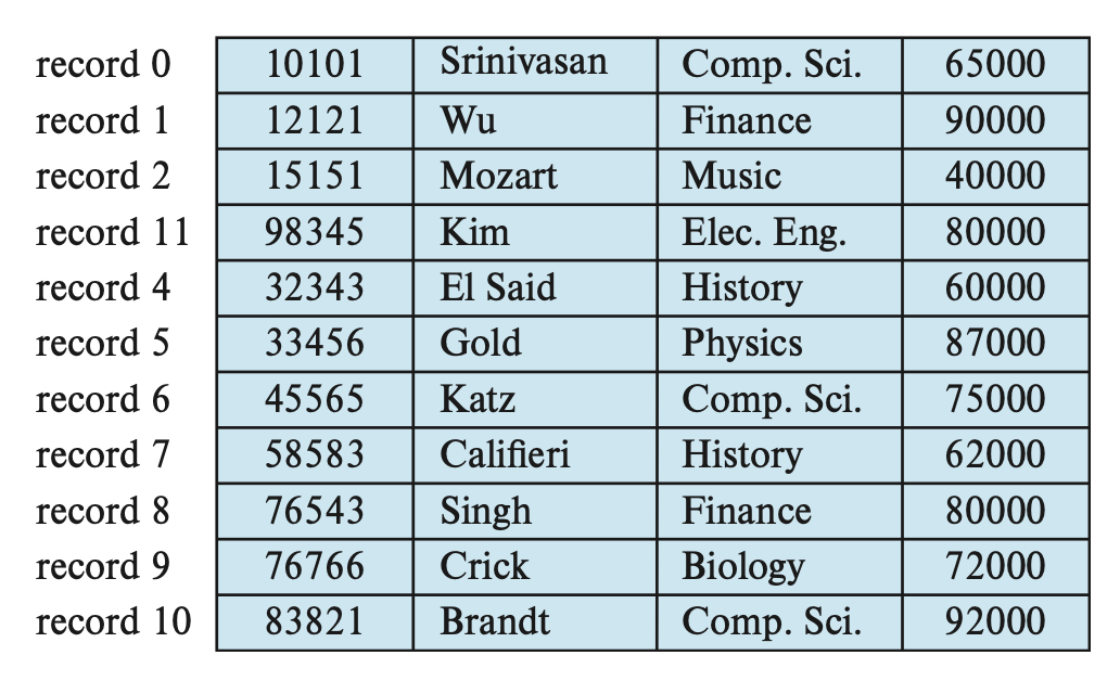 - 堆(heap) 文件组织:任何记录可以放在文件的任何地方,无需考虑顺序。一个关系可以存放在一个或多个文件中。