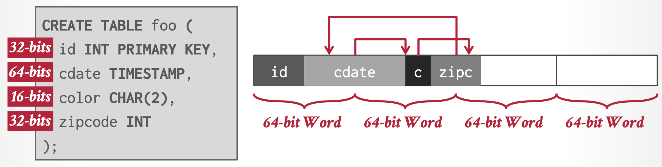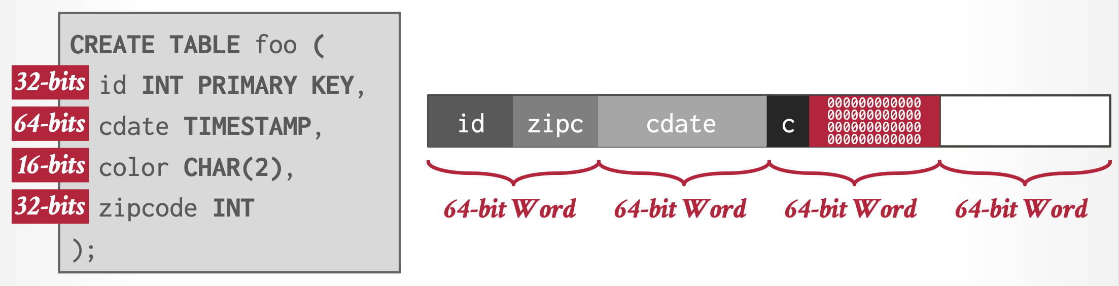 前面提到过,元组 / 记录中的数据本质上就是一个字节序列,并且包含了一个记录元数据的头。DBMS 负责追踪并解释这些字节为属性,它想要确保元组是按字对齐的(word-aligned),确保 CPU 访问数据时不会发生异常行为或干额外的活。有两种方法可以做到这一点:
