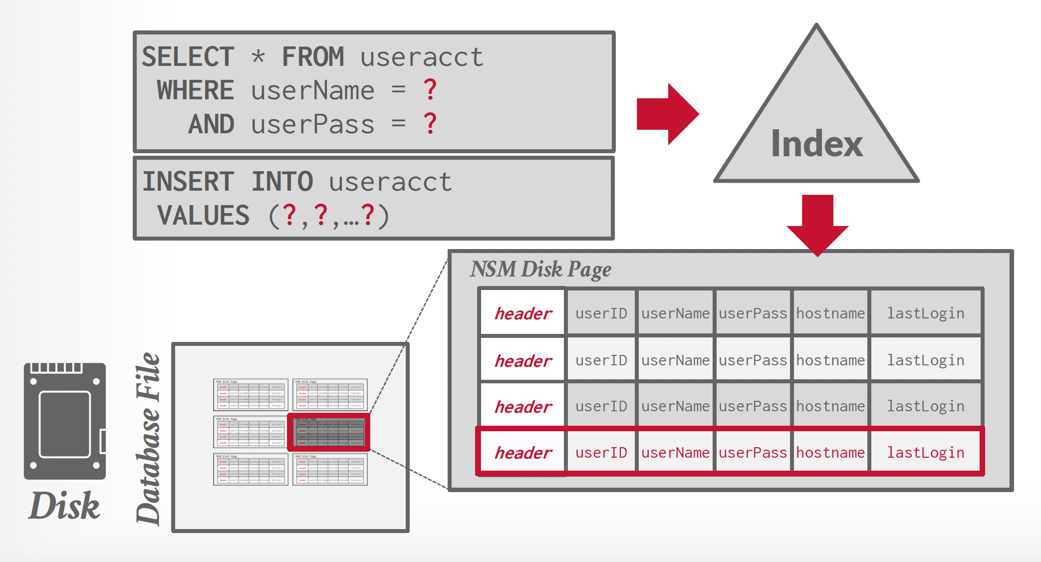 N 元存储模型(N-ary storage model, NSM):等价于面向行的存储,适用于写操作较多,或者访问内容多为独立实体的情况