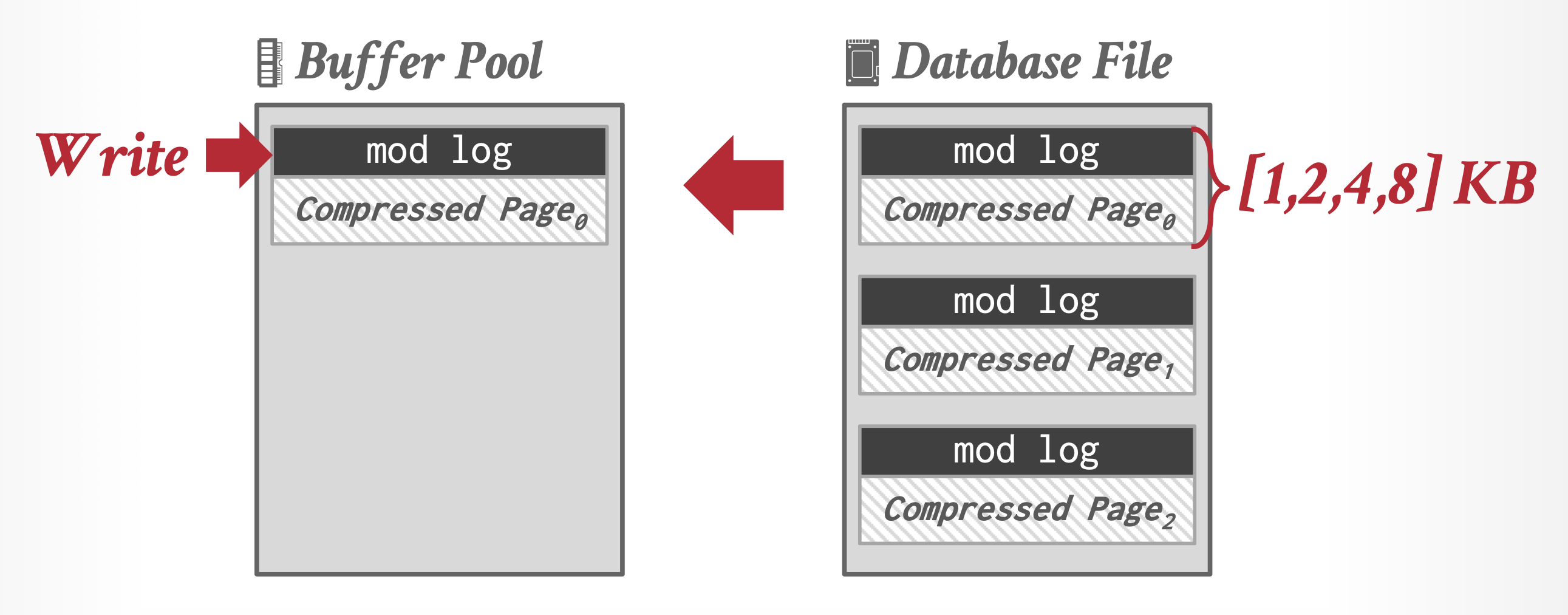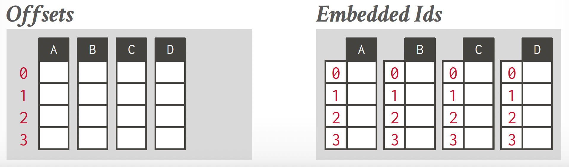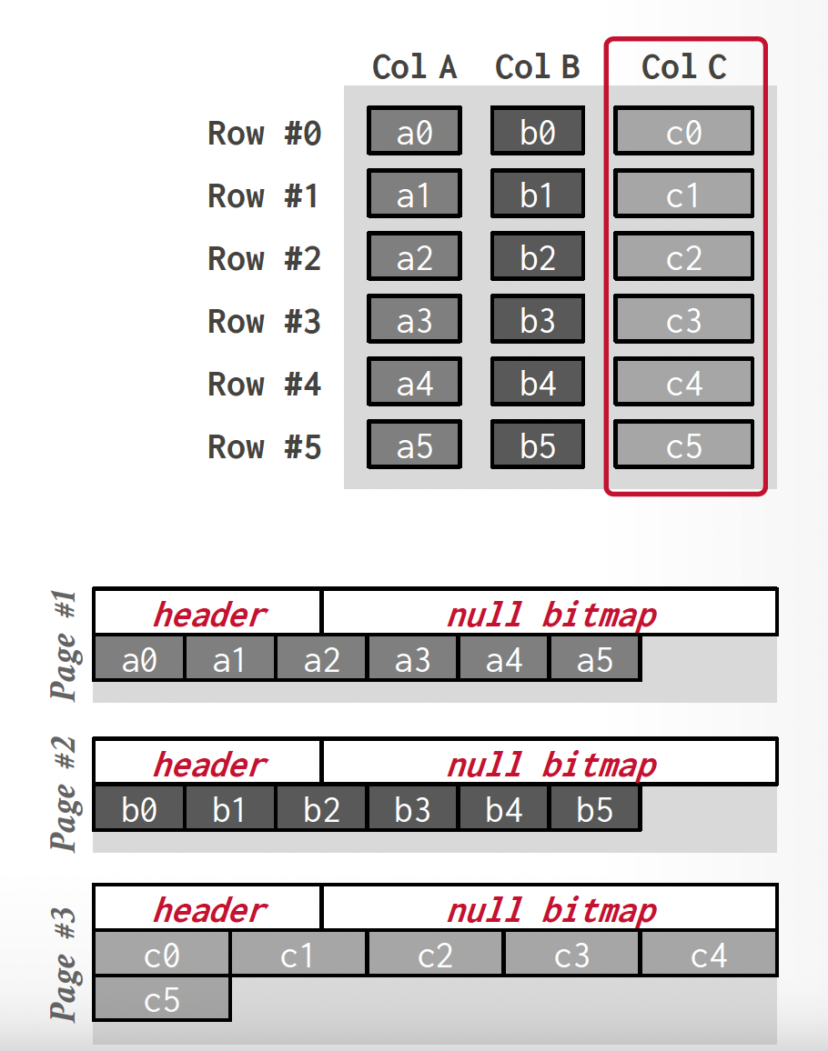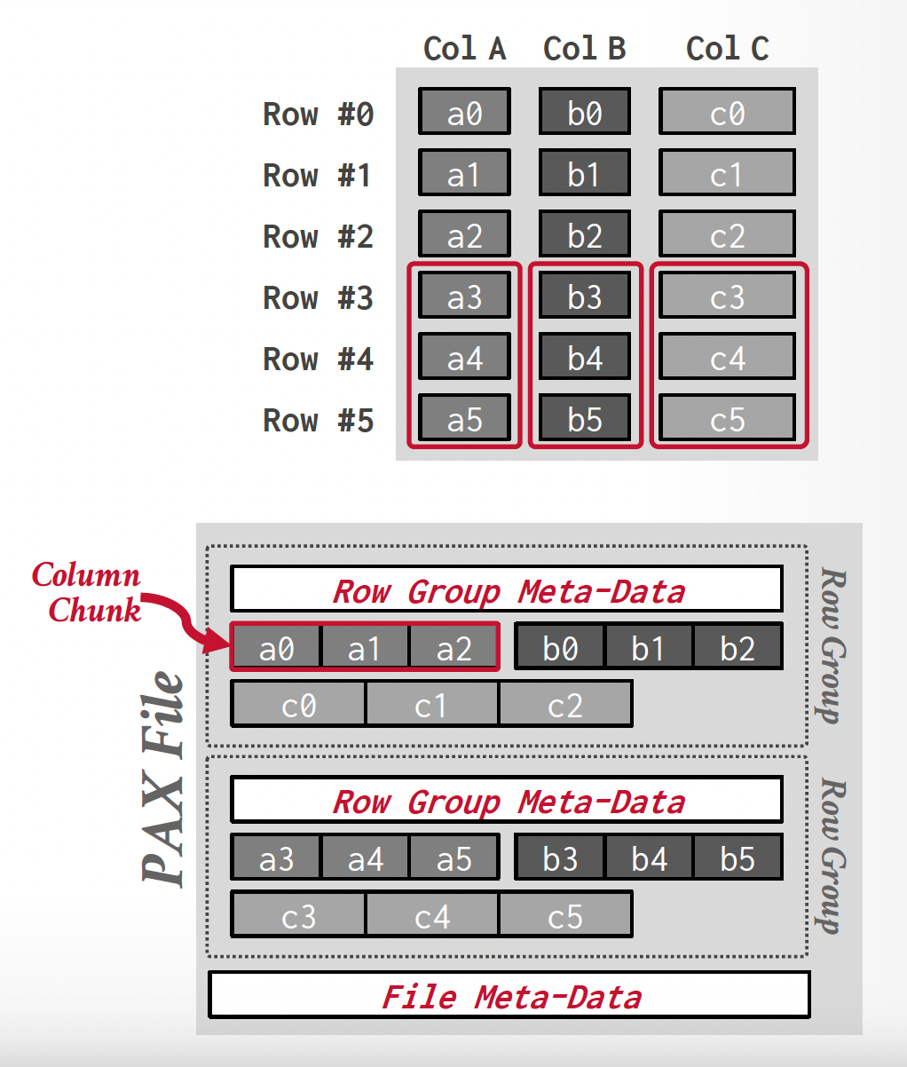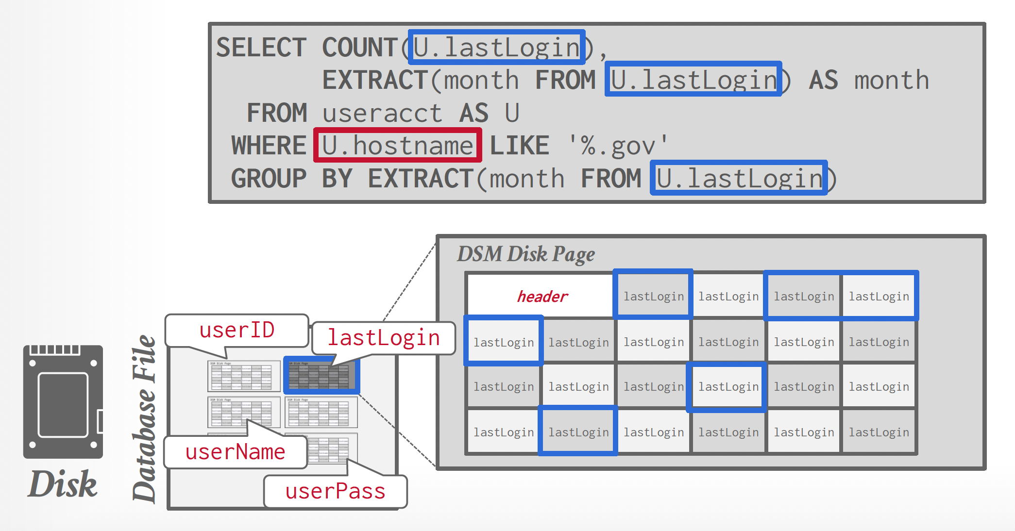 跨分区属性(partition attributes across, PAX):DBMS 从竖直方向上将属性划分为一个个数据库的页,并且从水平方向上将行划分为多组行,这样能确保兼具列存储的快速处理和行存储的空间局部性。