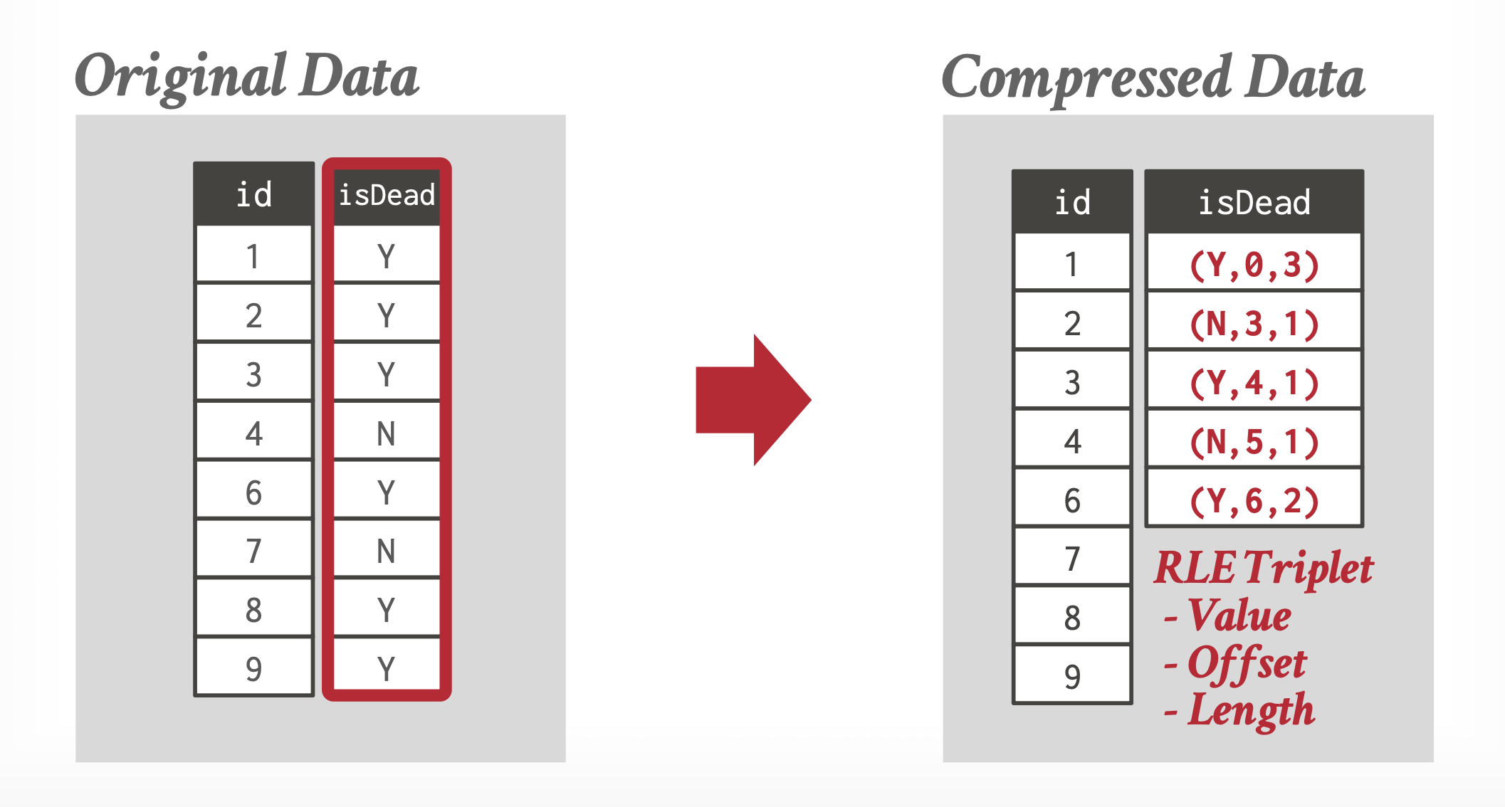 游程编码(run-length encoding, RLE):将某个列值相同的一组连续实例压缩成三元组,包括:属性值、偏移量和长度