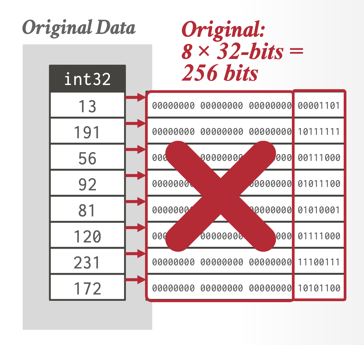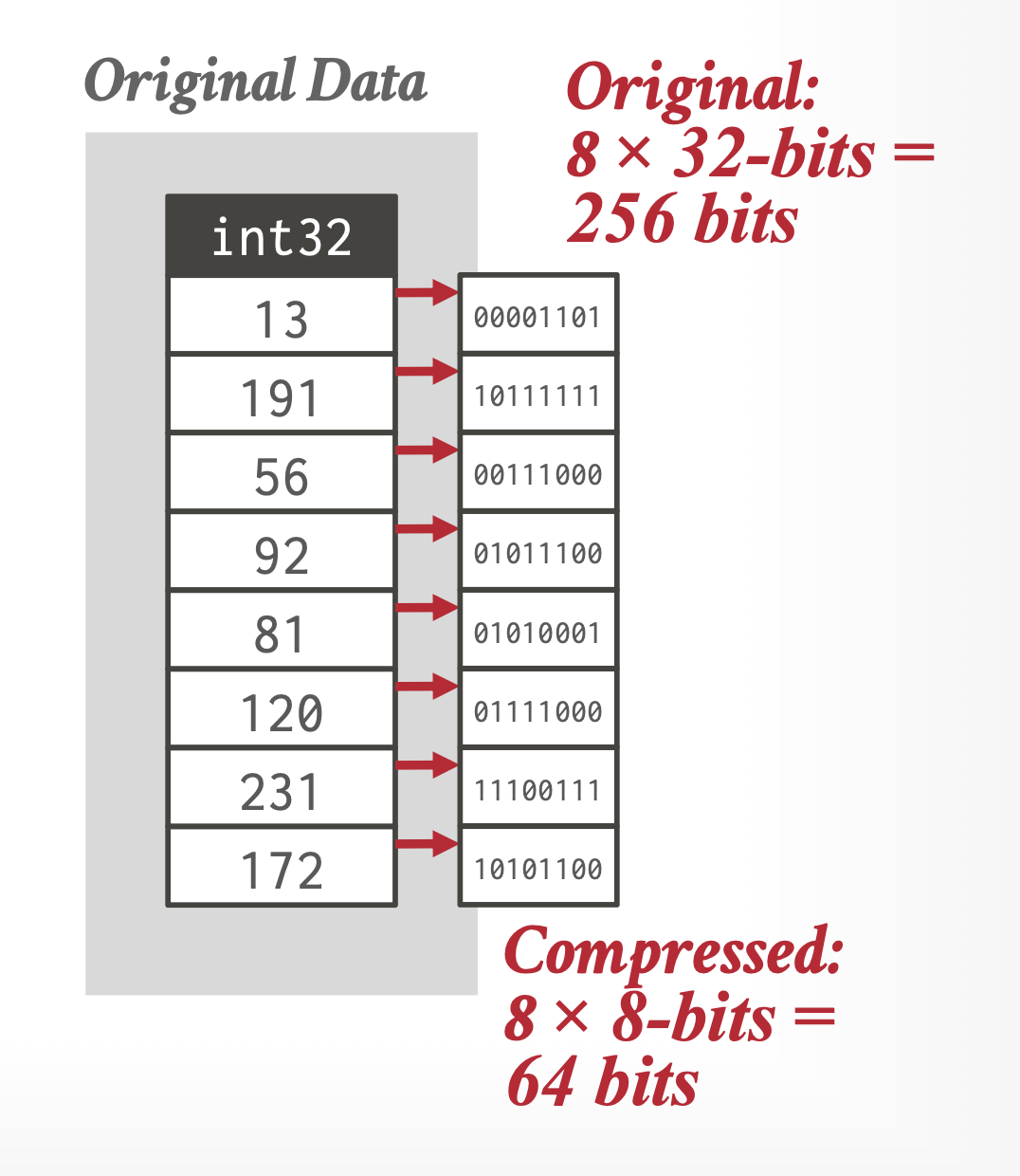 位打包编码(bin-packing encoding):当一个属性的值都小于该值声明的最大大小时,用更少的位存储它们