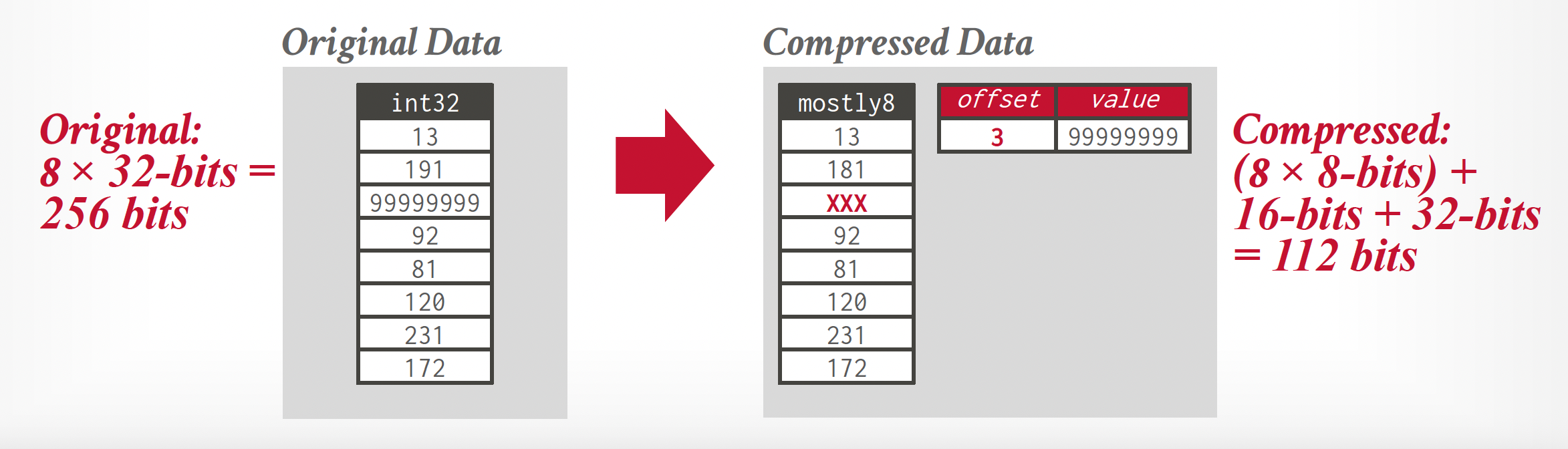 ? )编码 (mostly encoding):位打包编码的一种变体,使用特殊标记来指示超过最大值的值,并维护一个查找表来存储这些值(适用于大部分值是小于最大值,只要少部分超过最大值的情况) -