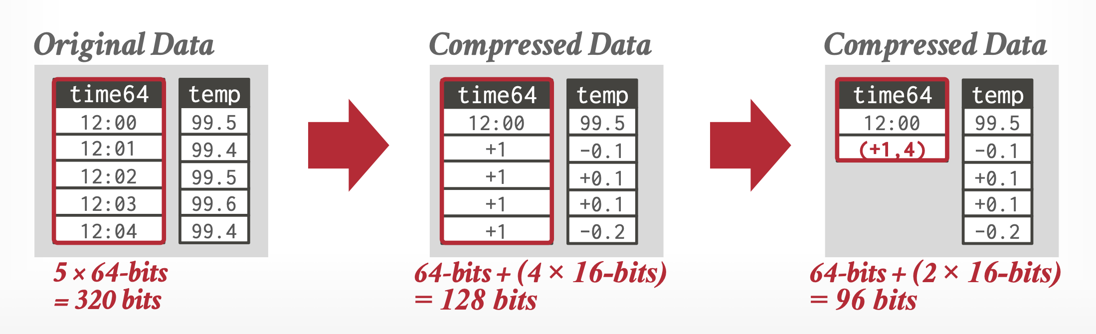 Delta 编码:不直接存储精确数值,而是记录同一列中相邻数值之间的差值。基准值可以内联存储,也可以存放在单独的查找表中