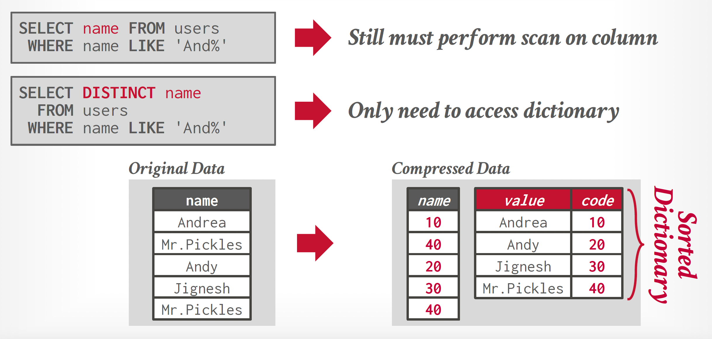 - 向量处理:很多现代 CPU 架构支持向量处理,即允许 CPU 对数组中的一些元素进行并行运算。按列存储的方式能够利用到向量处理的优势,比如比较一个属性和一个常量,聚合运算等等。