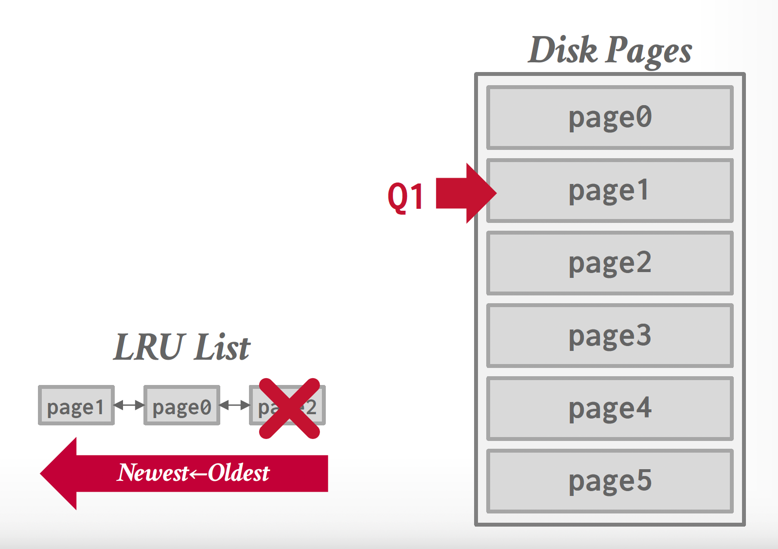 替换策略的目标是最小化对硬盘的访问。在操作系统中,我们会假设最近被引用的数据块可能在将来不久后会被再次引用。因此,如果要替换某个数据块的话,那就替换最久没有被引用的数据块,这种方法称为最近最少使用(least recently used, LRU)。