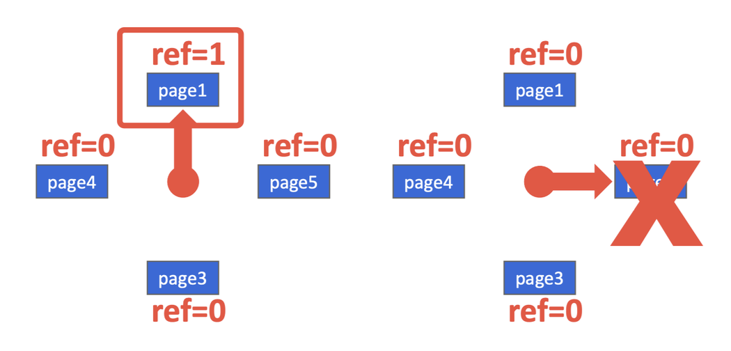 由于 LRU 的实现相对复杂,因此有一种近似的 LRU 实现,称为时钟(clock)。此时无需为每个页单独记录一个时间戳,而用一个引用位(reference bit) 来替代;当某个页被访问时,其引用位置 1。然后我们将这些页放在一个“环形 (circular)”缓冲区内,然后用一个“时钟指针 (clock hand)”按顺序扫过这些页:检查指针所指的页的引用位是否为 1,如果是的话则置 0,否则的话就讲这个页驱逐出去。