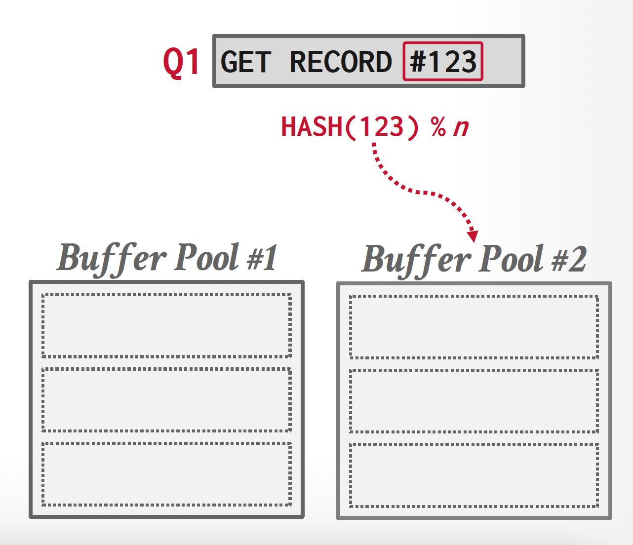 - 哈希:DBMS 将页 ID 哈希,选择指定的缓存池