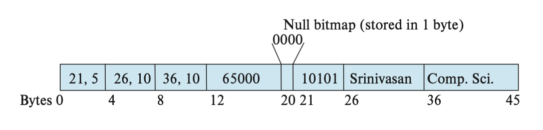 可以看到,这个记录先存的是三个变长属性的定长信息,然后是一个定长属性值,最后是变长属性值。而在定长属性值和变长属性值之间有一组 0,称为空位图(null bitmap),用于记录属性值是否为空。在这个例子中,由于一条记录有 4 个属性,因此用 4 个 0 来分别表示每个属性值的情况。假如 salary 为空,那么空位图的第 4 位就会被设为 1。有些情况下,空位图会被放在记录的开头位置,这样做可以节省空间(因为一旦空位图全为 1,后面就不需要存数据了