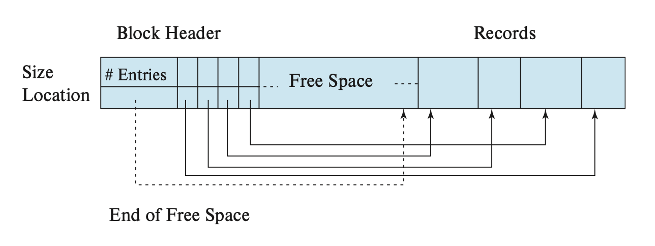 - 如何在一个块内存储变长记录,使得从块中提取记录较为容易