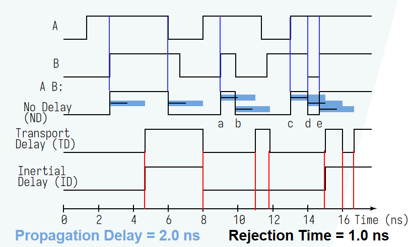 - 惯性延迟 (inertial delay):类似传输延迟,但如果出现小于拒绝时间 (rejection time) 的脉冲变化,则输出将不会发生变化。