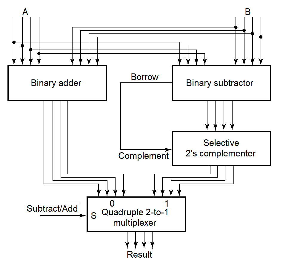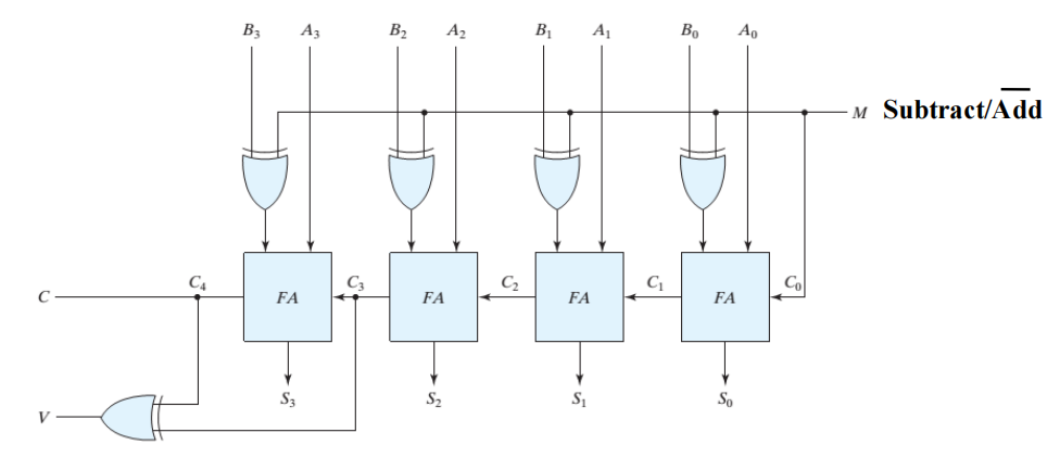 - 当 \(S = 1\) 时,此时通过异或的取反作用,加上 \(C_0 = 1\),我们得到了 B 的补码,执行减法