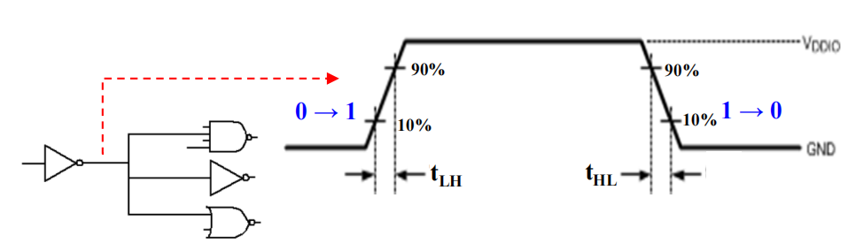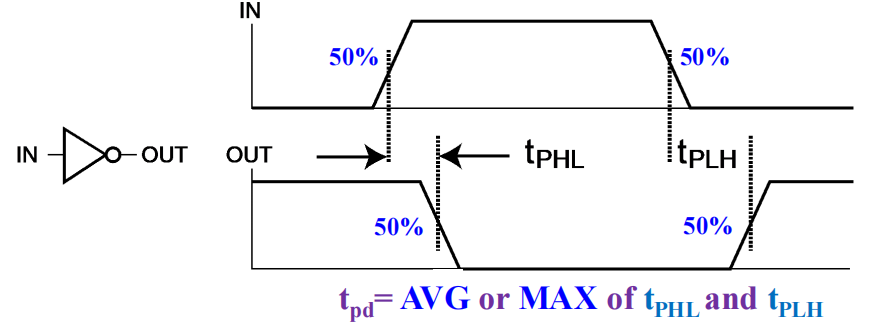 高到低(\(t_{PHL}\)) 和低到高(\(t_{PLH}\)) 的输出信号的改变可能有不同的传播延迟。这两者只与输出有关,与输入不相关。