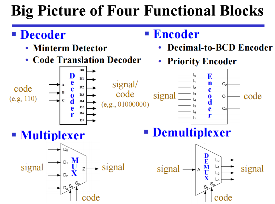 - 自底向上 (bottom-up design) 从细节的、原始的块出发,将它们结合起来,形成更大更复杂的函数块,着重于细节。它回答了:我们如何构建电路?