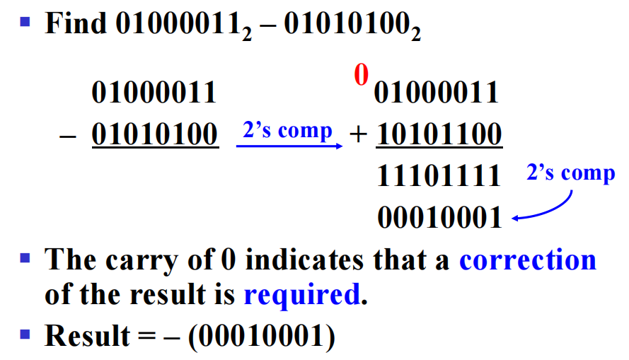 - 如果发生借位,取结果的补码,它的符号为第 1 个操作数的符号