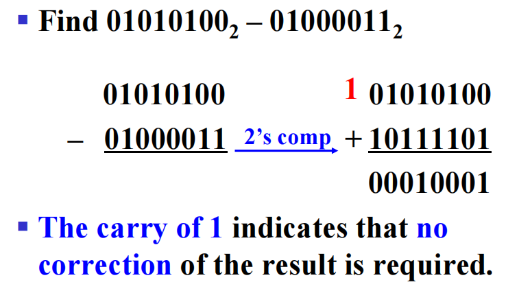 - 如果 \(M \ge N\),加法产生的末进位 \(2^n\) 直接扔掉,保留 \(M - N\)