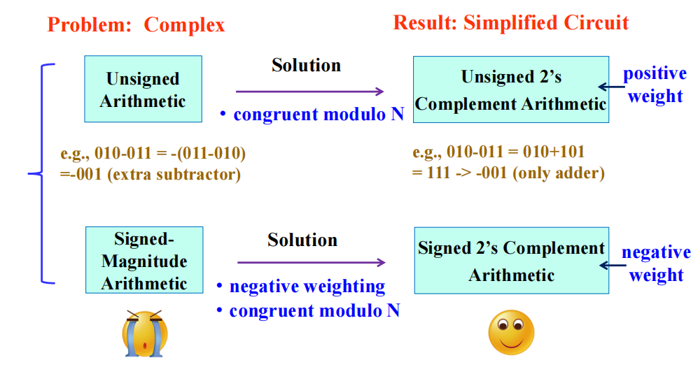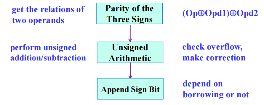 注:比较无符号算术和用补码的无符号算术,可以发现后者可以少用一个减法器,因此设计上更加简单,成本也得到降低